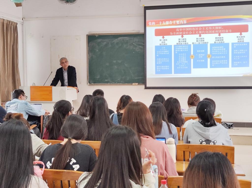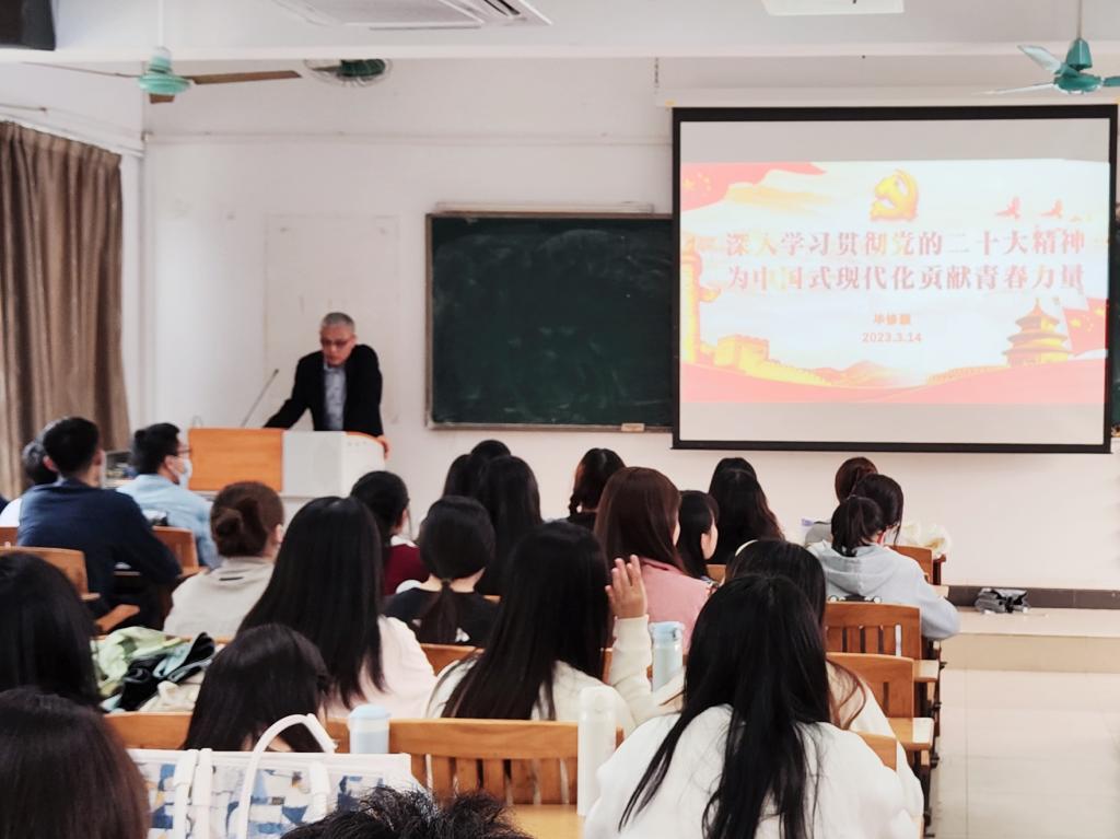 第一部分,毕副董事长首先带领同学们深入学习、准确把握党的二十大精神,从过去极不寻常、极不平凡的五年到新时代十年的伟大变革。其中讲到过去三年的抗疫历程,同学们深有感触。在党和国家的坚强领导下,全国人民凝聚力量,团结一致,取得了疫情防控的决定性胜利,有效保护人民群众生命安全和身体健康,打赢了这场极不平凡的疫情防控阻击战。其次,毕副董事长讲到,习近平新时代中国特色社会主义思想是坚定自觉坚持和发展马克思主义的典范,要深刻领悟“两个确立”的决定性意义,增强“四个意识”、坚定“四个自信”、做到“两个维护”。最后,毕副董事长强调:展望中国青年,立足新时代征程,要担当青年之责,高举中国特色社会主义伟大旗帜,为全面建设社会主义现代化国家而奋斗,为中国式现代化贡献青春力量。
