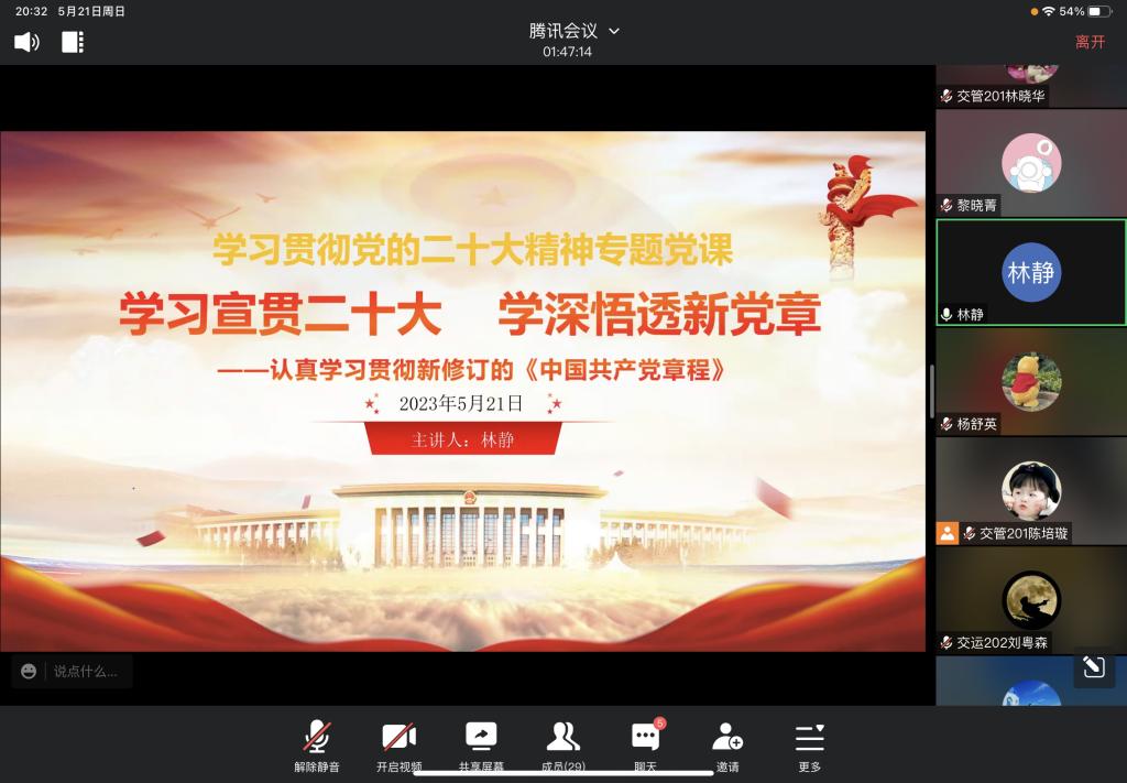 上课期间,林静书记从《中国共产党章程》的基本概述、深刻领会二十大党章修正案的重大意义、学习领会党章修改的主要内容等四个方面对二十大党章修正案进行了深入浅出的解读与阐释,并为同学们在日常学习、实际工作中如何更好地学习贯彻党的二十大精神提供了生动的实践指导。同时,林静书记也强调:要把党的二十大精神融入自身、融入学习、融入工作,做到学思用贯通、知信行统一,把习近平新时代中国特色社会主义思想转化为坚定理想、锤炼党性和指导实践、推动工作的强大力量。