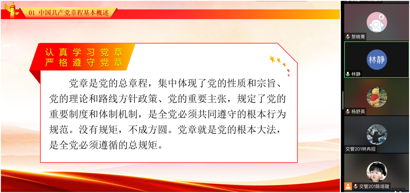 课程的最后环节,林静书记指出:全体支部党员要切实提高政治站位,把学习贯彻党章作为学习宣传贯彻党的二十大精神的重要内容,进一步增强学习党章、遵守党章、贯彻党章、维护党章的政治自觉和行动自觉,切实把党章要求落实到日常学习和实际工作当中。