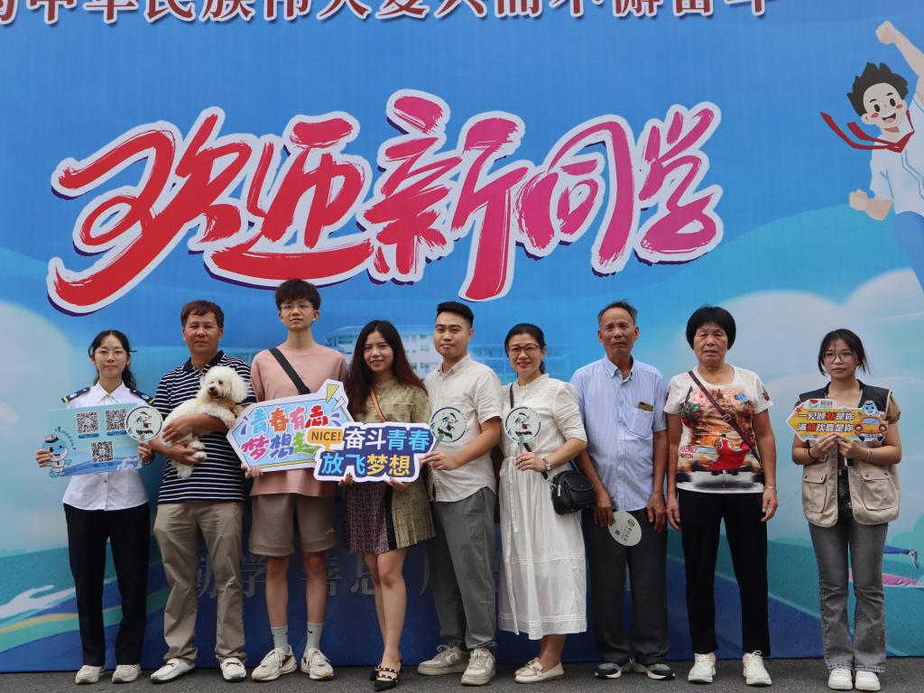 校园内外道路两侧,整齐列队的彩旗迎风招展,校门口海蓝底色的大型展板中间,“欢迎新同学”5个大字活灵活现,校园内外充满浓厚的喜庆氛围。