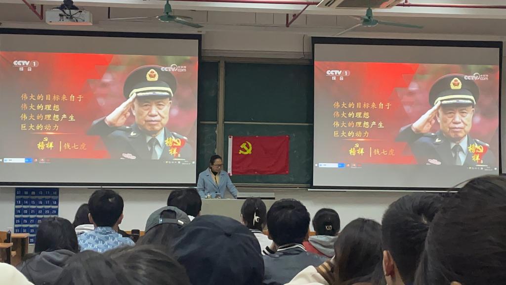 会议第二部分,与会师生一同观看了《榜样8》专题节目,该节目邀请钱七虎、刘玲琍、唐菊兴、吴惠芳、李桂科、热孜万古丽·沙吾提6名党员和浙江省余姚市梁弄镇横坎头村党委讲述他们的故事,彰显基层党组织战斗堡垒作用和党员先锋模范作用,彰显了共产党人坚定信仰、担当作为、服务群众、无私奉献的精神风貌。林静老师指出,党员、预备党员、发展对象和入党积极分子均要在学习上、生活上、工作上充分发挥先锋模范作用,贯彻全心全意为人民服务的宗旨。